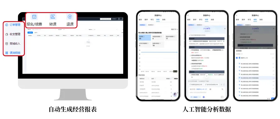 招生来源、课消情况、学员留存等核心数据自动生成报表,帮机构清晰了解运营状况,精准调整特色化发展方向。 -