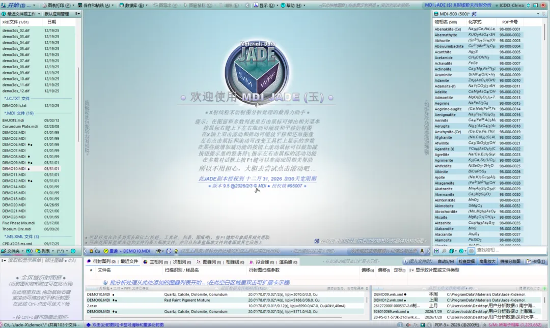国际衍射数据中心(ICDD)出版发行的标准衍射数据库(Powder Diffraction File, PDF卡片数据库)主要用于X射线衍射数据即XRD数据的物相鉴定和定量分析。ICDD-MDI发行的JADE软件,目前分为每年更新的JADE Pro版和永久授权的JADE Standard两个版本,为中立的全功能分析粉末XRD数据的软件,结合PDF数据库可实现粉末XRD数据的物相鉴定、定量分析、Rietveld精修、应力应变分析等功能。内置有中文、英文和日文界面,满足各类用户需求。
