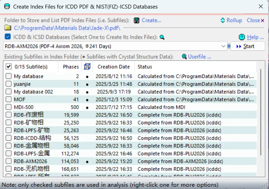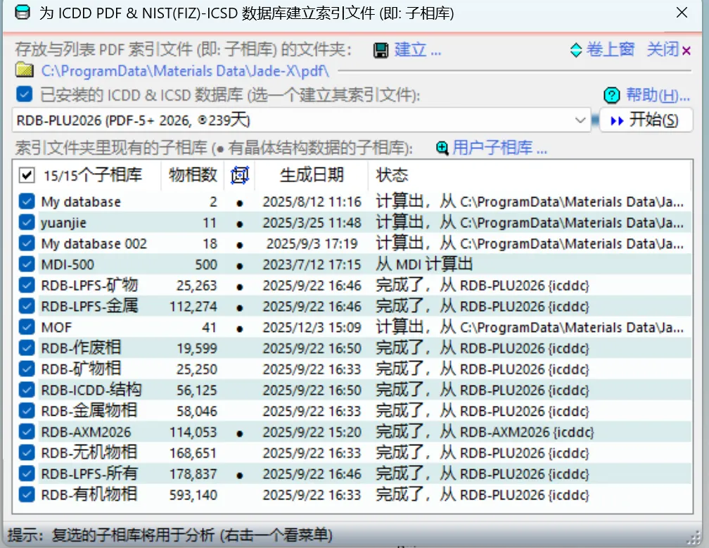 4.所有支持的相关PDF数据库(即RDB数据库)安装好后,都将自动显示在此对话框中的数据库下拉列表中,选择其中一个数据库并确保其授权许可,并在JADE中建立索引文件。点击“开始”按钮(Start),所选的数据库将在JADE中建立索引文件,以便利用PDF数据库在JADE软件中进行快捷物相检索和定相分析。