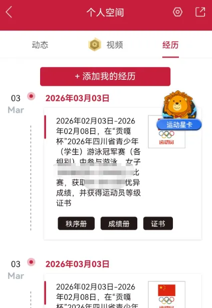 1、在首页右下角“我的”-右上角“个人空间”-右下角“经历”中。此处可查看所有证书相应项目的比赛时间、比赛名称、项目及成绩,并能下载相应比赛的秩序册、成绩册;点击进“证书”之后可对证书进行放大和缩小。此处的证书只能截屏保存,但截屏之后的图片品质倒不差。