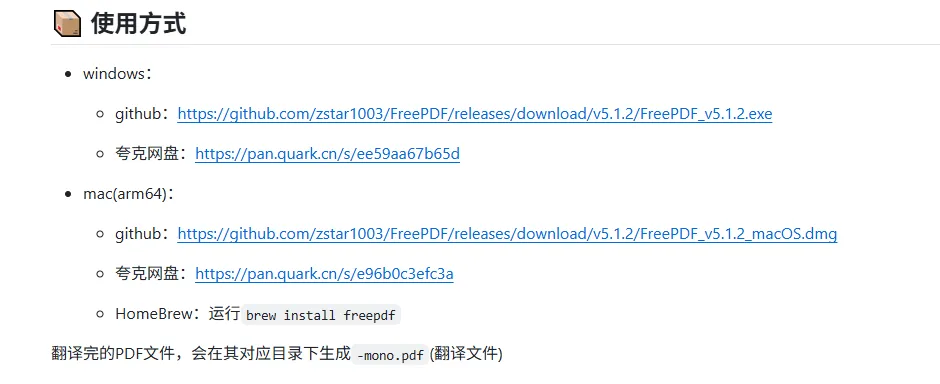 windows:github:https://github.com/zstar1003/FreePDF/releases/download/v5.1.2/FreePDF_v5.1.2.exe夸克网盘:https://pan.quark.cn/s/ee59aa67b65dmac(arm64):github:https://github.com/zstar1003/FreePDF/releases/download/v5.1.2/FreePDF_v5.1.2_macOS.dmg夸克网盘:https://pan.quark.cn/s/e96b0c3efc3aHomeBrew:运行brew install freepdf