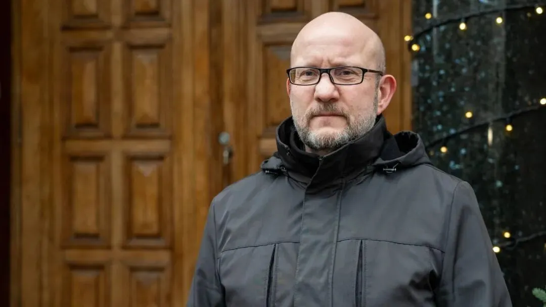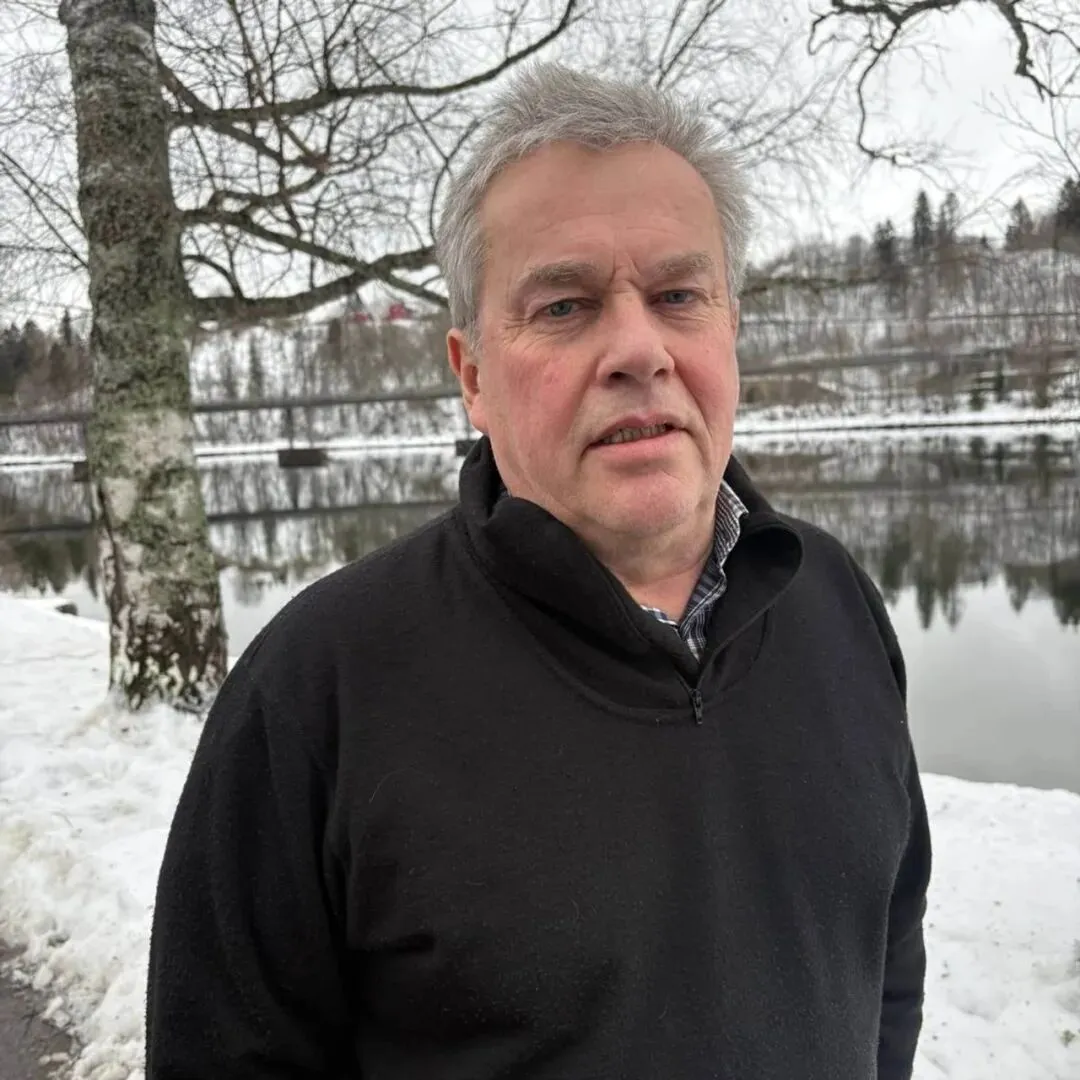 一个男人站在一座大型木制房屋前,背景有一对双开门。他穿着一件带帽的黑色外套。周围的环境包括绕着一个柱子垂挂的灯串。图片给人一种冬季的氛围。/ 照片:Jorunn Hatling / NRK