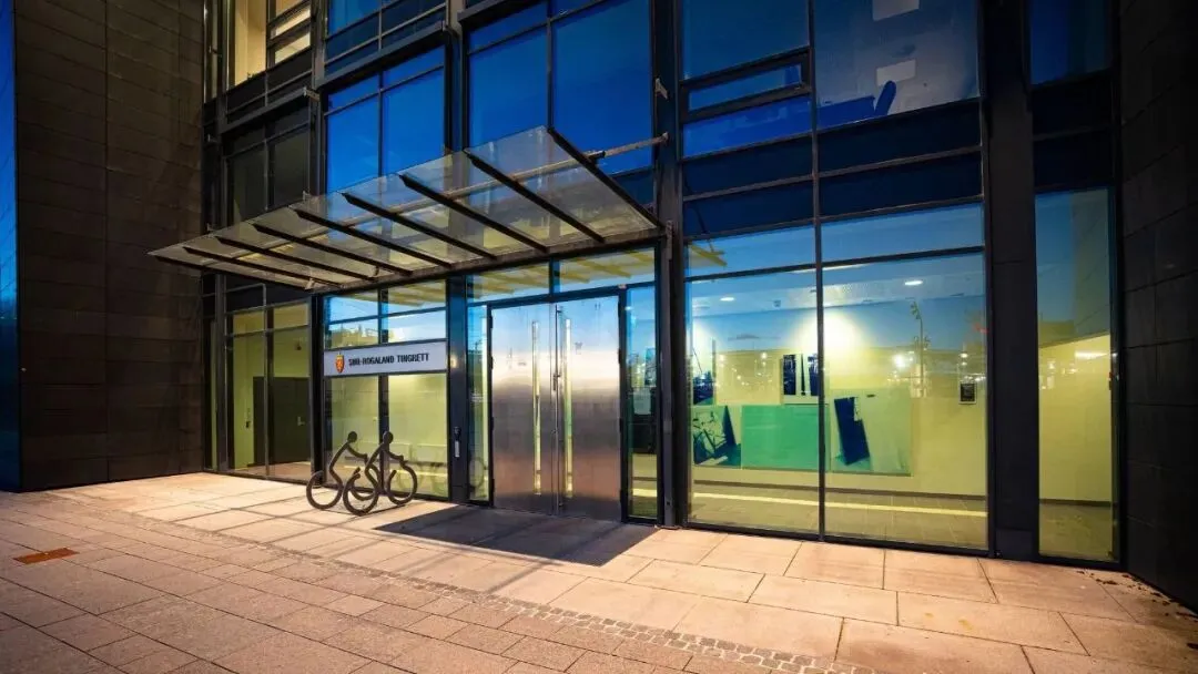 一座有玻璃门的建筑。牌子上写着Sør-Rogaland tingrett。/ 照片:Ole Andreas Bø / NRK