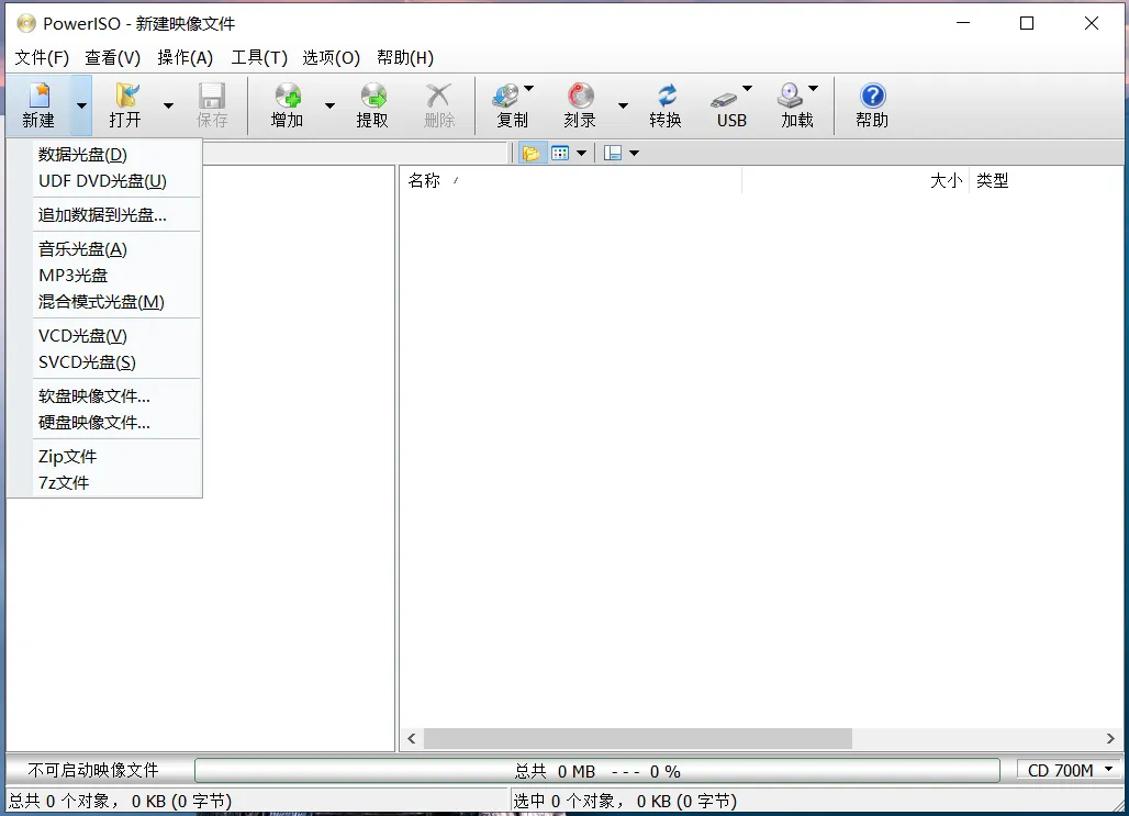 默认情况下,编译将包括iso9660和Joliet文件系统。如果要创建DVD ISO文件,可以单击工具栏上的“新建”按钮或选择“文件>新建>UDF DVD”菜单。还可以通过单击窗口右下角的媒体类型区域来更改媒体类型。