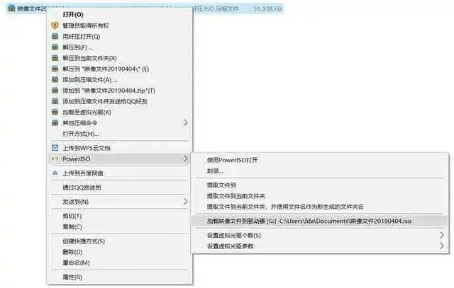 右键单击映像文件,在弹出的快捷菜单选择“PowerISO>加载映像文件到驱动器”选项。