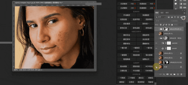 AI智能识别引擎「质感磨皮+自动瘦脸」力度三级可调,全自动人脸识别多通道质感磨皮参数自动匹配,支持单张或批量图像一键处理。