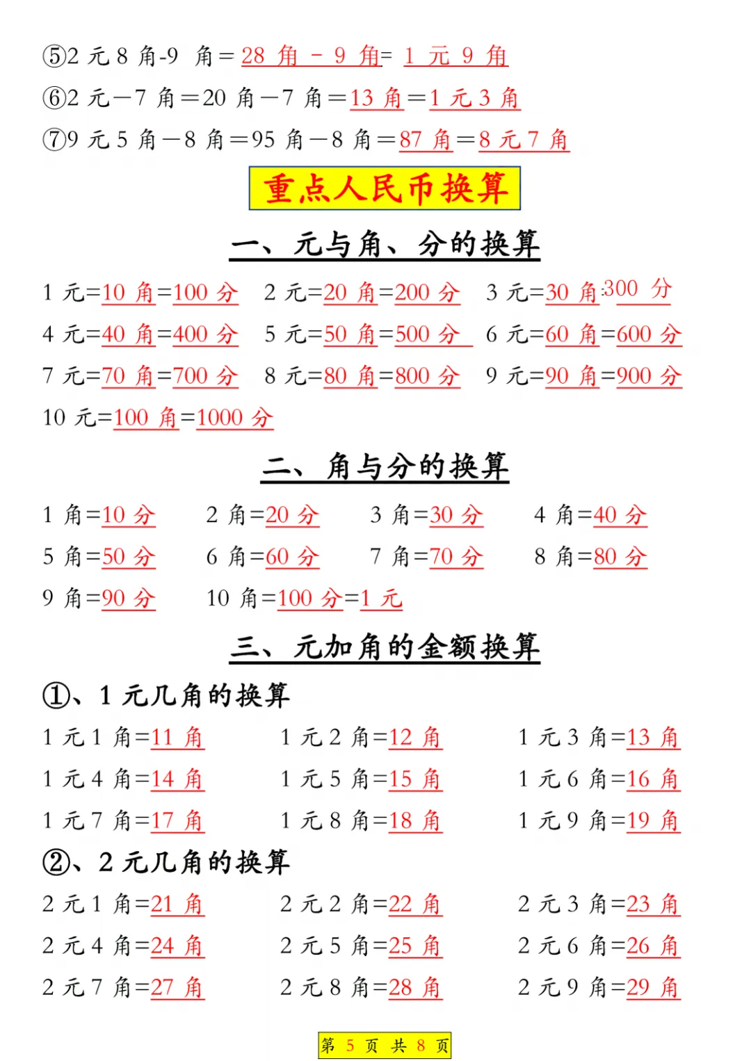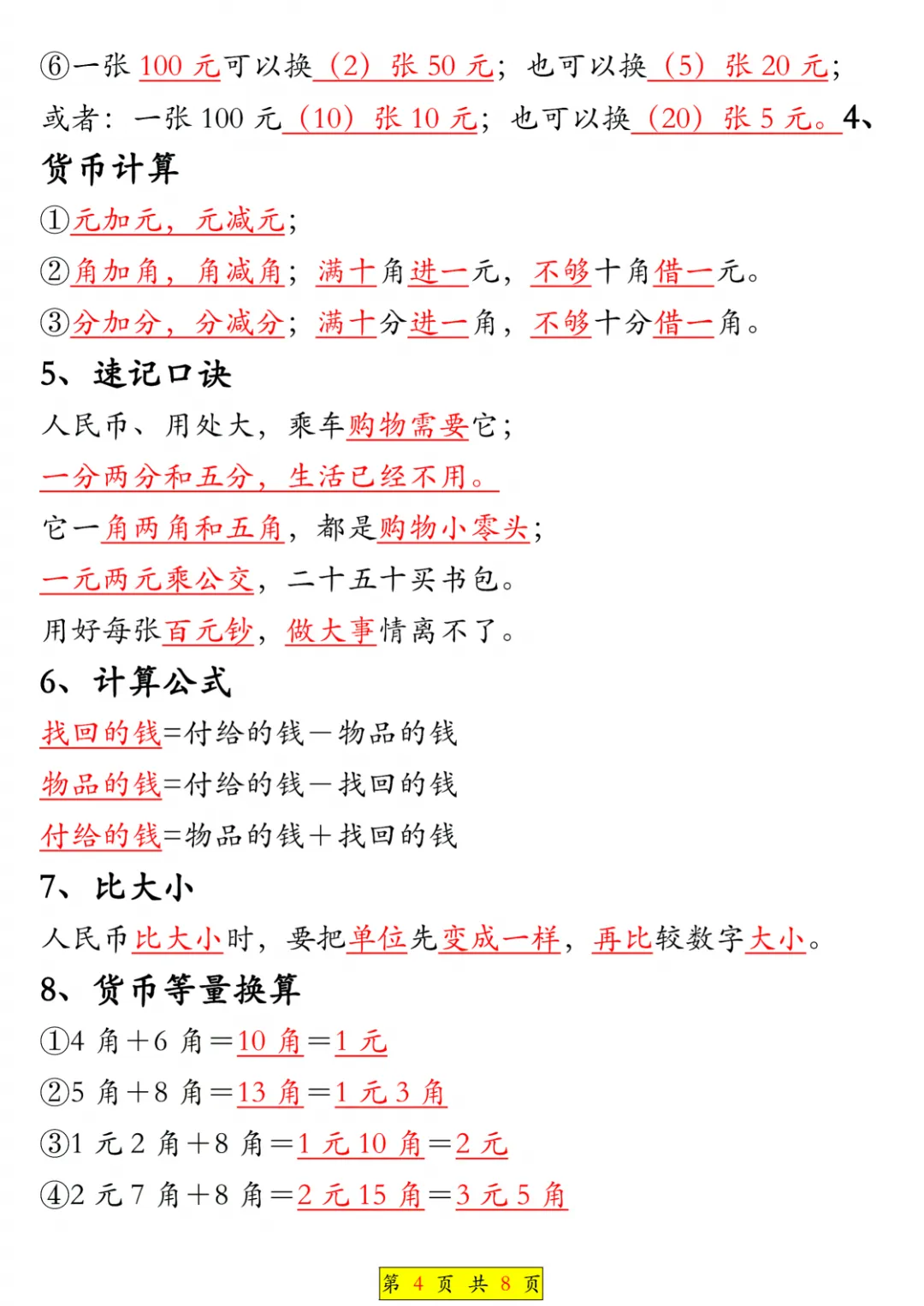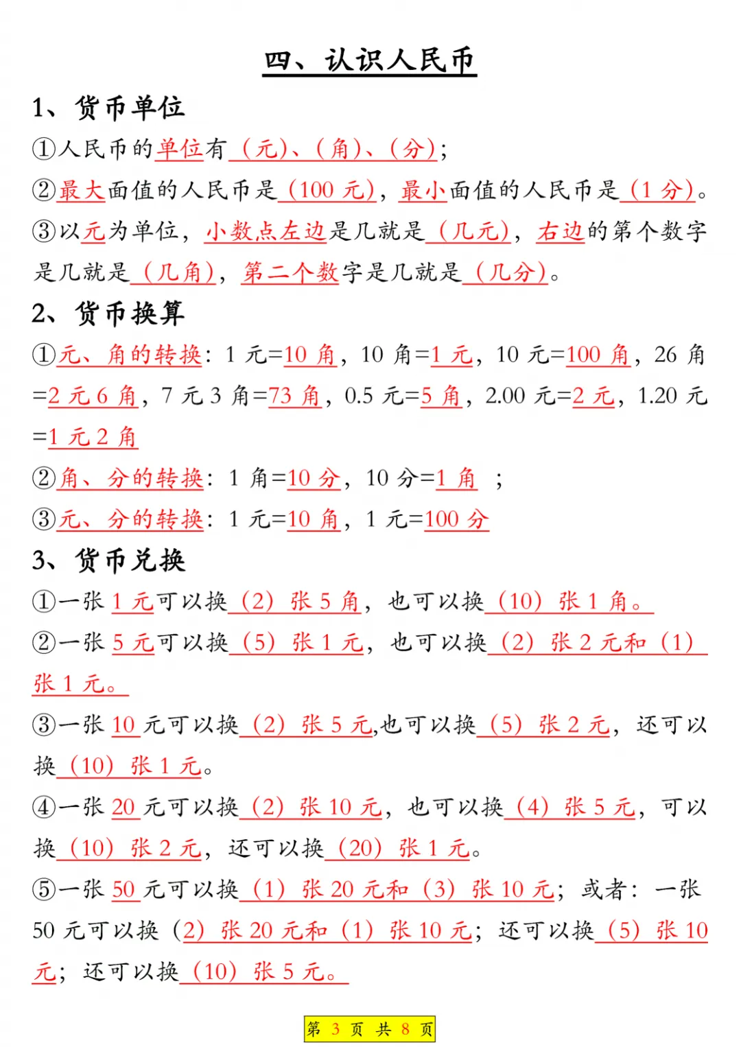 一年级数学学习必备!这份人教版知识点汇总涵盖认识图形、加减法、100 以内数的认识、人民币换算等核心内容,公式、口诀、换算技巧全整理,同步课本进度。打印出来让孩子每天记一点,夯实基础,家长辅导有抓手,轻松应对课堂练习~
