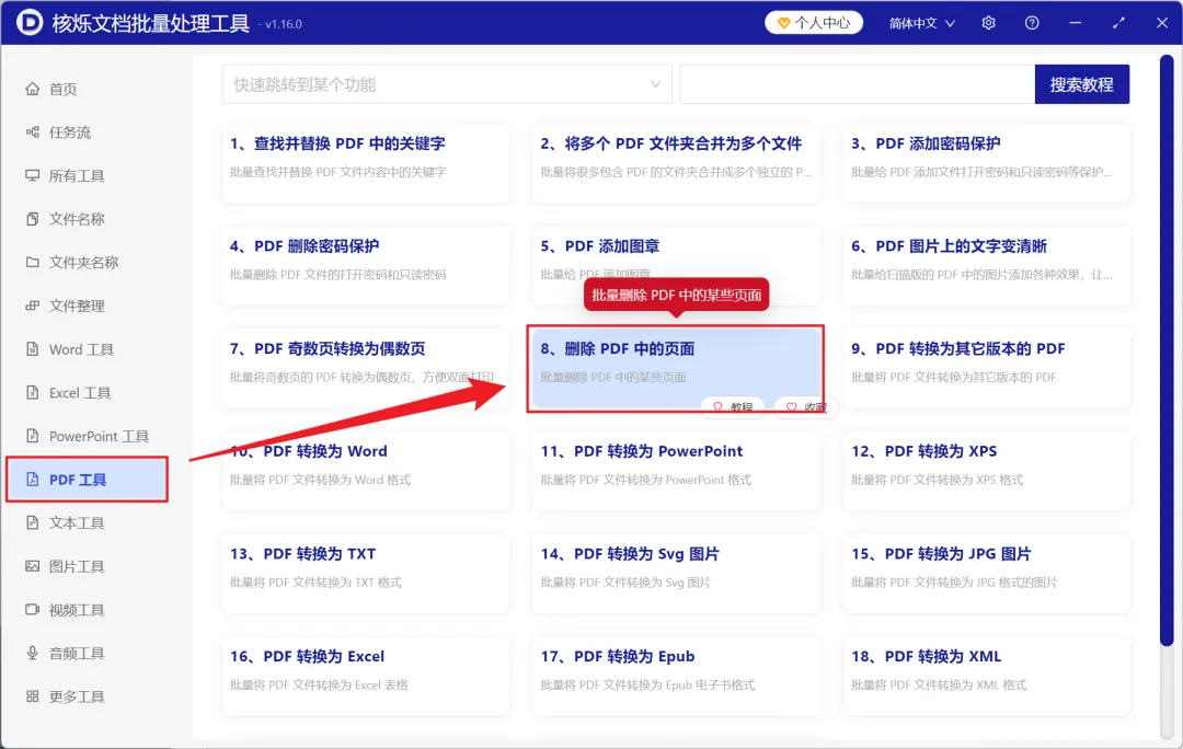 1、打开【核烁文档批量处理工具】,选择【PDF 工具】- 【删除 PDF 中的页面】。