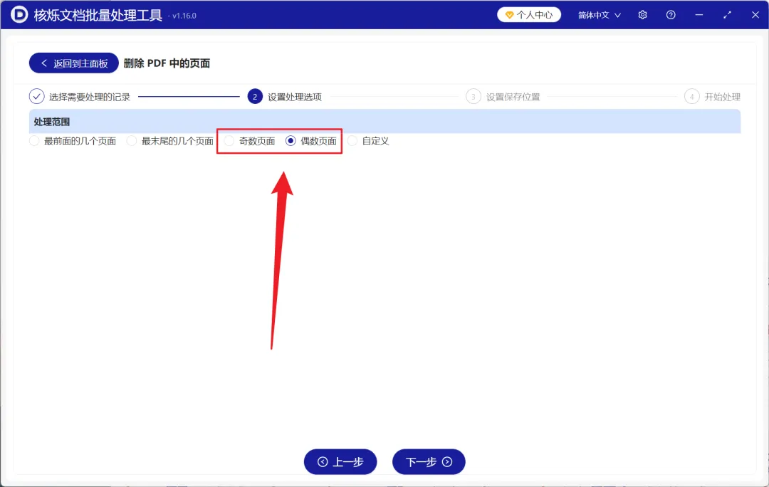3、进入设置界面之后,处理范围我们可以根据需求选择【奇数页面】或【偶数页面】,最后再次点击下一步。接着点击浏览,选择好新文件的保存位置。