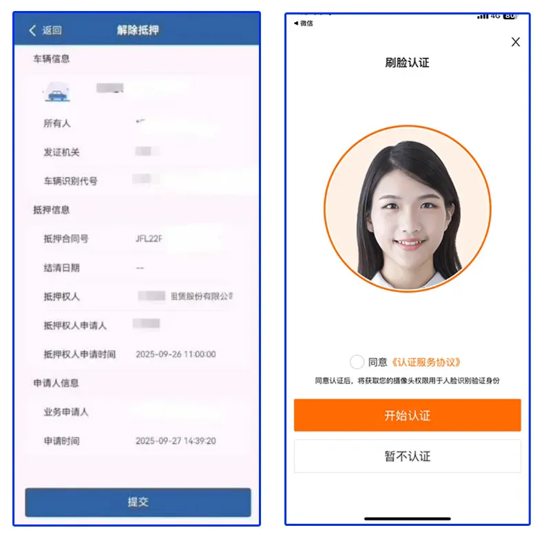 首先金融机构通过部级平台或省级综合应用平台接口在线提交解除抵押业务申请后,系统同步生成“交管12123”APP解除抵押确认待办信息,并短信告知车主,车主登录APP完成解除抵押确认申请。