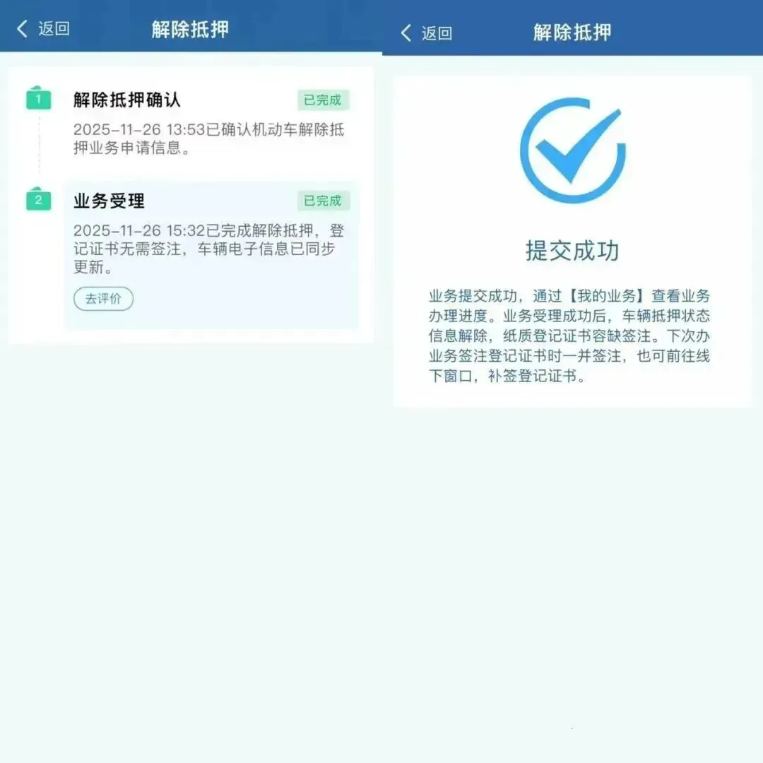 提交确认后,系统自动受理并更新车辆抵押状态。完成后,APP页面将显示“未抵押登记”,无需再到车管所签注。若需补签登记证书,可在后续办理其他业务时同步完成。