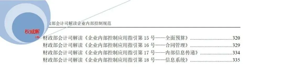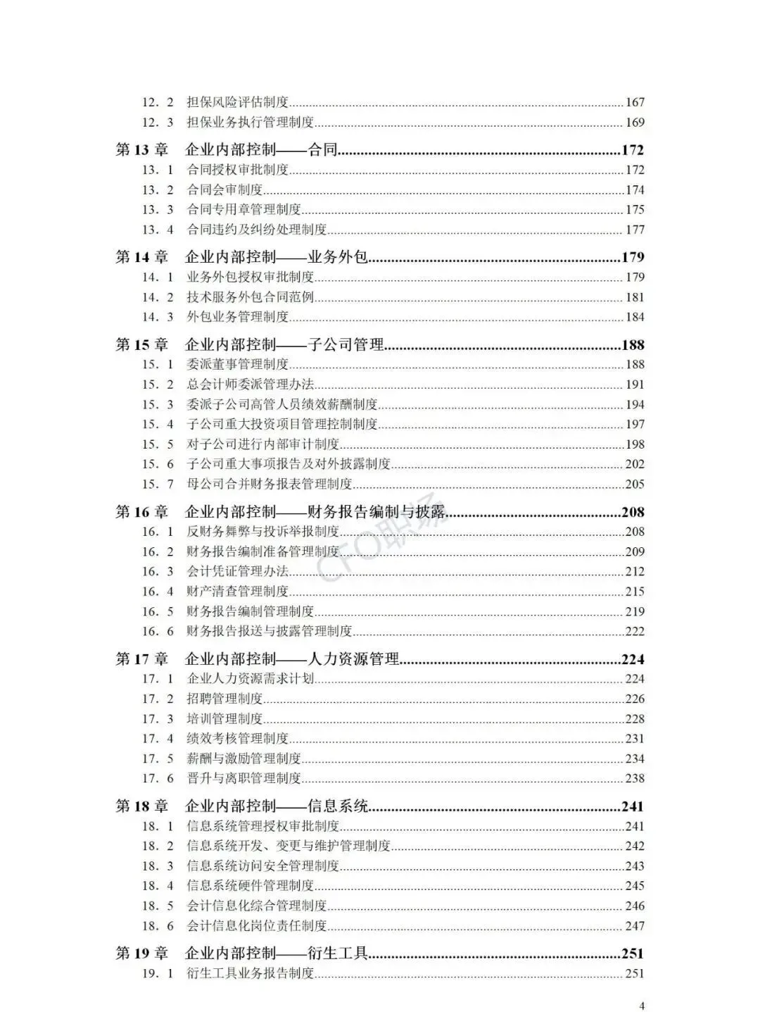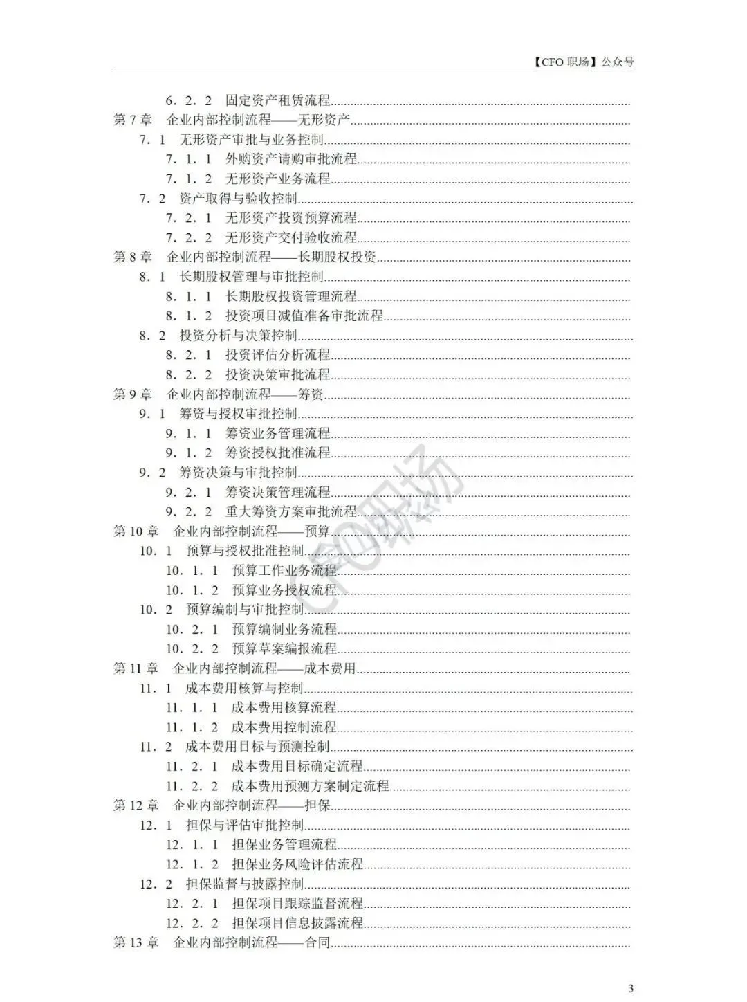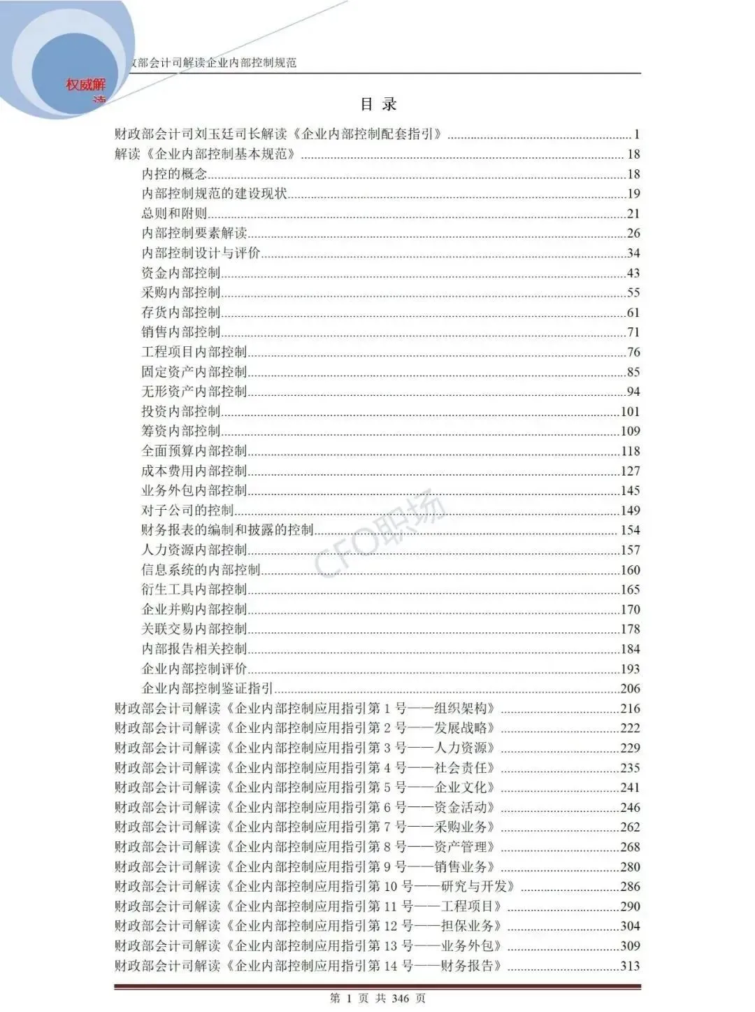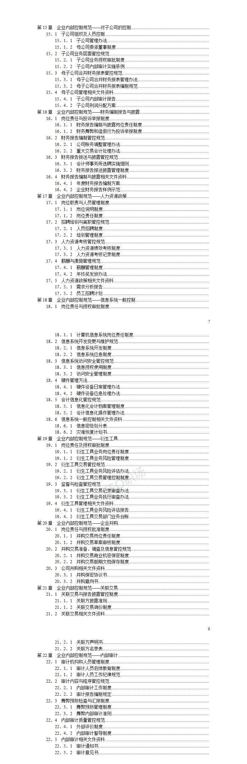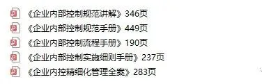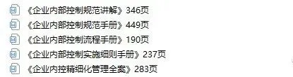 本期精选资料包含: 《企业内部控制规范讲解》346页、《企业内部控制规范手册》449页、《企业内部控制流程手册》190页、《企业内部控制实施细则手册》237页、《企业内控精细化管理全案》283页;手册分别从资金、采购、存货、销售、工程项目、固定资产、无形资产、长期股权投资、筹资、预算、成本费用、担保、合同协议、业务外包、子公司控制、财务报告编制与披露、人力资源、信息系统、衍生工具、企业并购、关联交易、内部审计等多方面来帮大家对公司进行管控等,资料预览如下:
