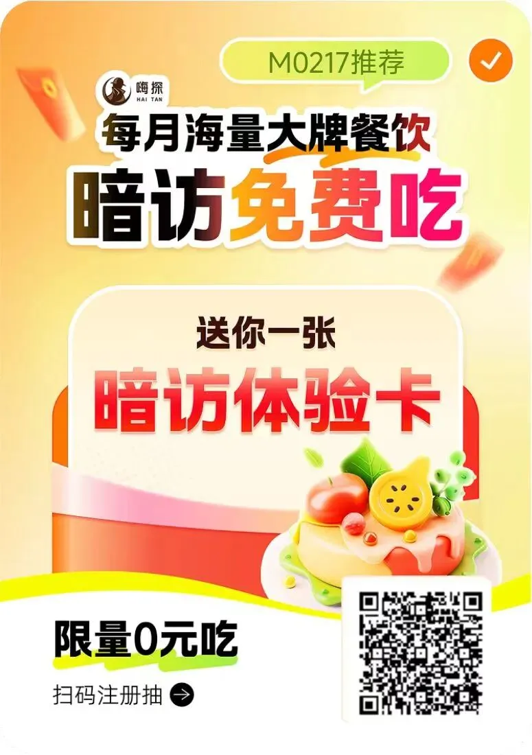 背景硬:合作 800 + 连锁品牌,西贝、绿茶等头部企业入驻,海底捞 “洞见者” 停运后,官方推荐通过嗨探报名神秘顾客活动;