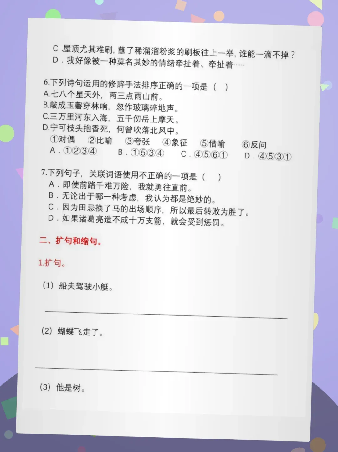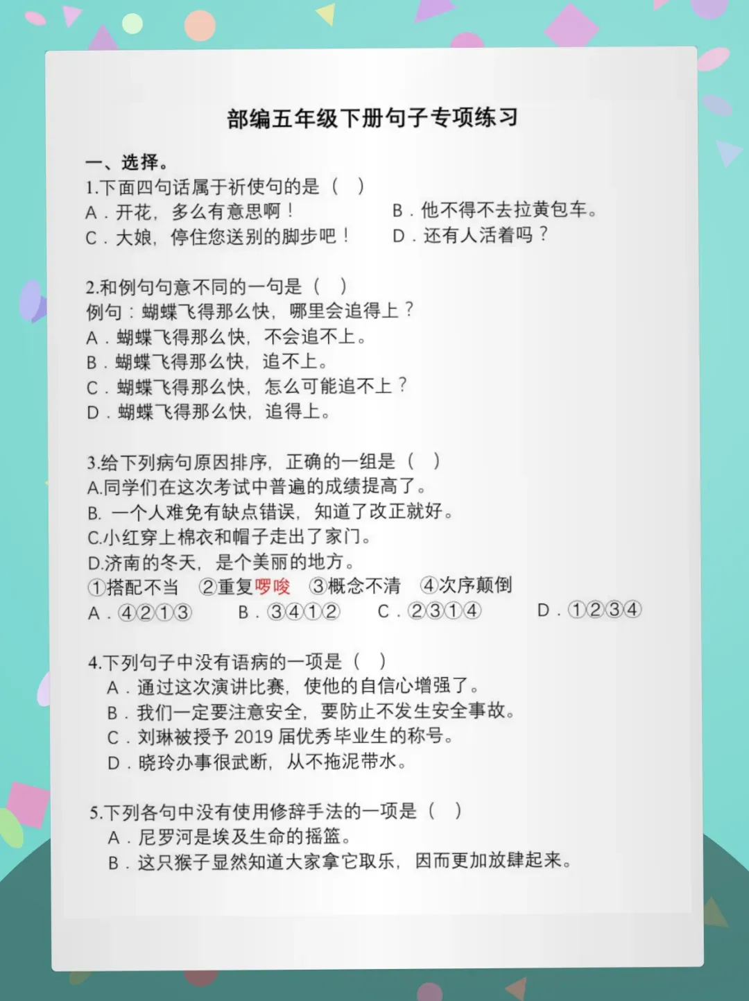 📚【核心亮点】紧扣部编版五年级下册语文课标,覆盖祈使句、病句修改、扩缩句、修辞判断、关联词、古诗文句式等全题型,答案详解+易错点批注,夯实基础不跑偏!