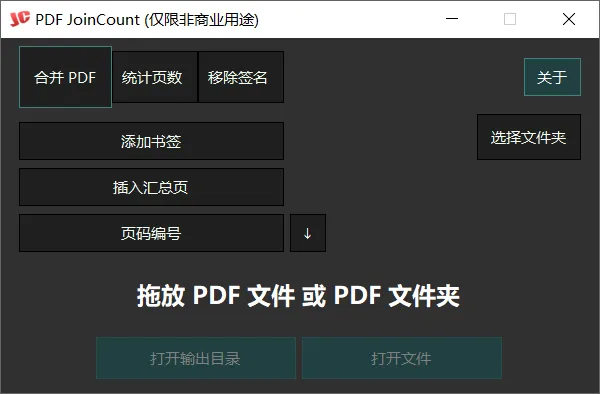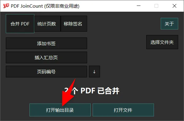 处理完成后,点击打开输出目录,即可快速定位文件,不仅如此,软件还支持统计页数、移除签名、添加书签、插入汇总页和页面编号功能。