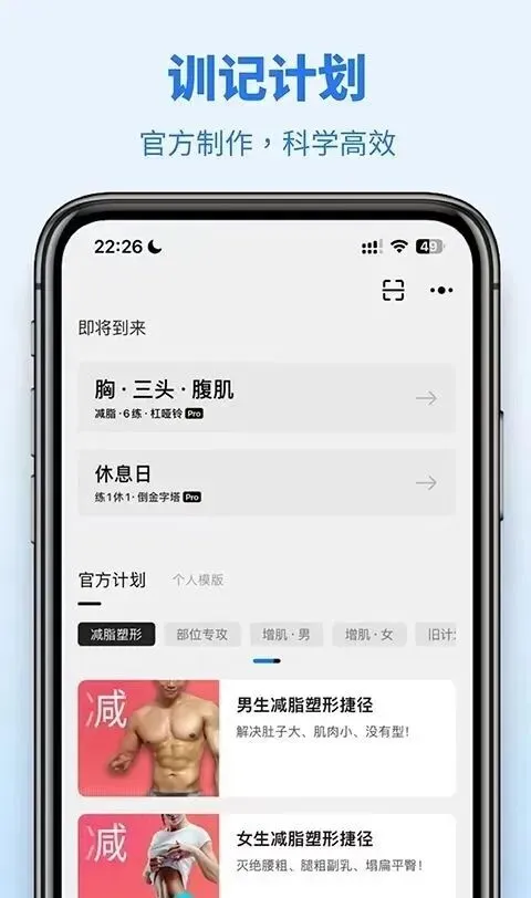 – 自定义计划:增肌/减脂/塑形,自由编排