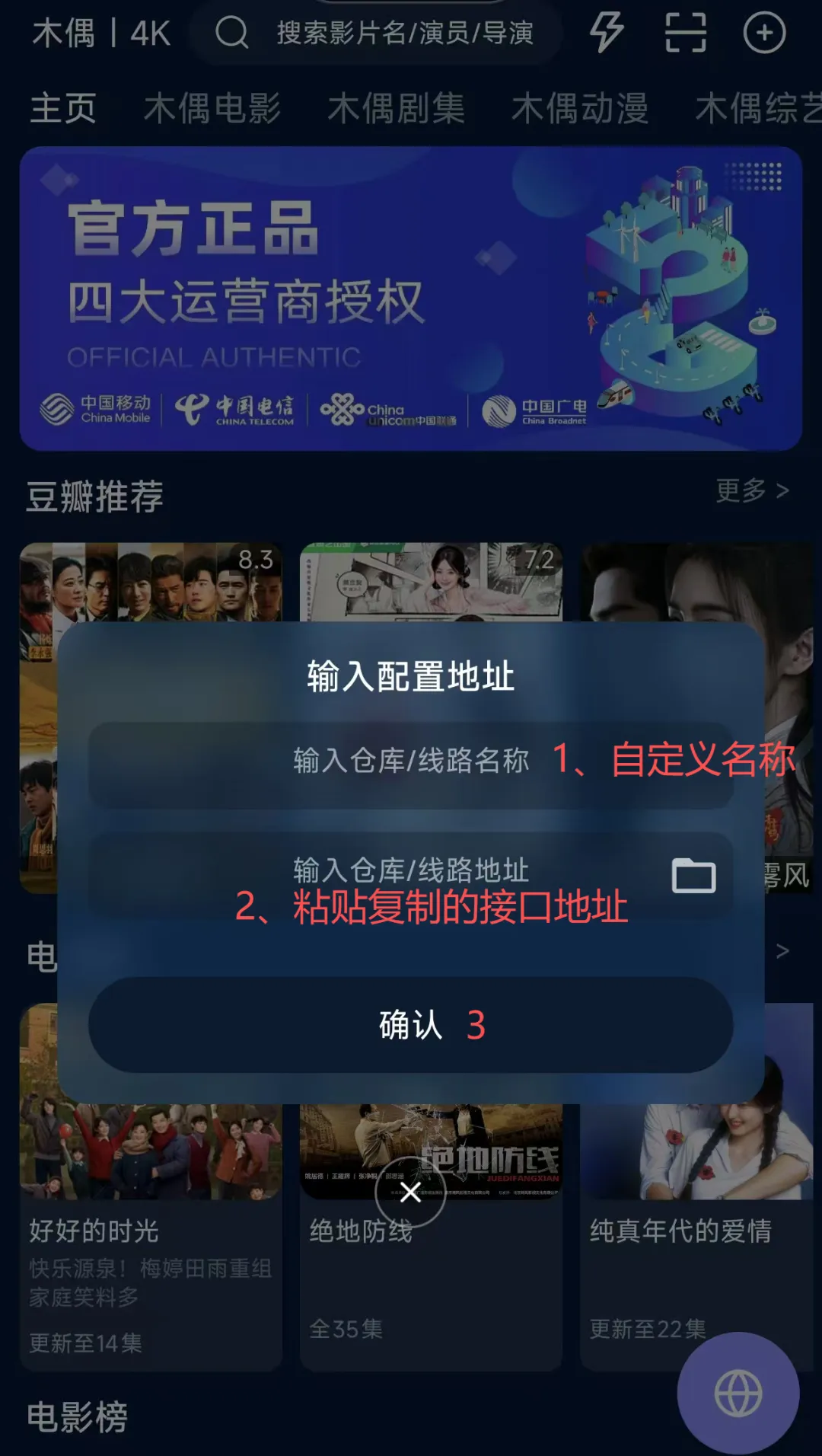 安装完打开app,复制一条接口,例如:“http://www.饭太硬.com/tv”,