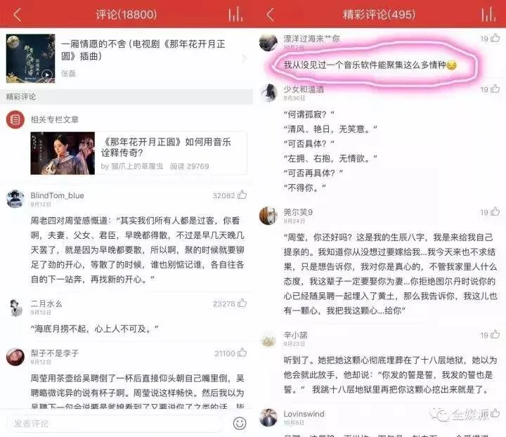 混迹音乐软件评论区的情圣,拥有随时随地为自己加戏的特殊技能。一句歌词、一段旋律就能牵扯出无限往事,剪不断,理还乱。比如前段时间,热播剧《那年花开月未圆》大结局,主题曲评论页面,堪比导演选角现场。