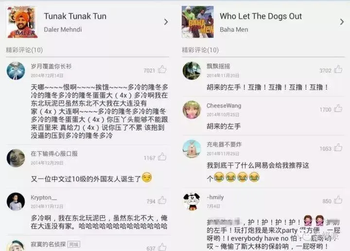除了比赛吹牛,我们再来围观一下逗比重灾区——“神曲”评论。逗比们在乡村非主流的道路上带着自己的节奏,隔着屏幕也能感觉到整齐划一的中二气质。他们极具内容生产的热情,在PK谁的脑洞更戳笑点的道路上,他们精益求精。