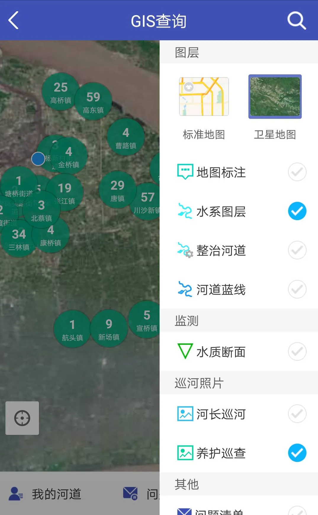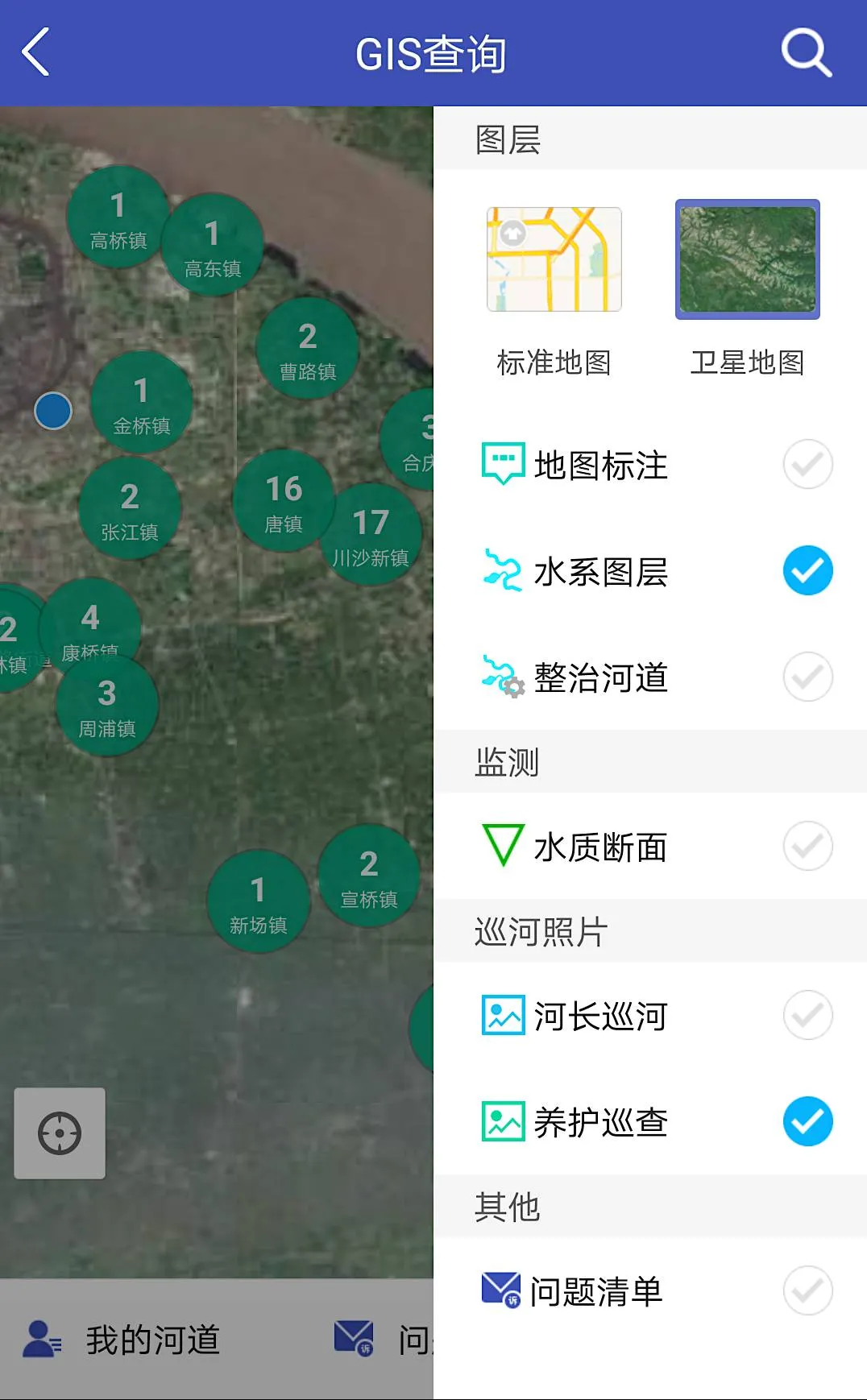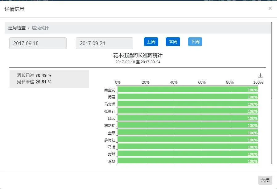 结合河长、河道二个维度,以新区名录内水体为基础,建立“河道一张GIS图”,各级河长通过GIS、图表等方式直观、快速、全面地掌握所管辖河道的基本信息、水质监测达标情况。