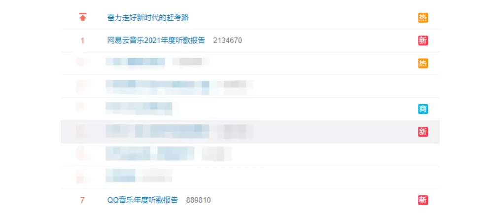 各大平台的年度听歌报告主题虽不相同,但主体内容差异并不大,比如年度歌曲、歌手等。年度听歌报告主要价值在于唤起用户的分享兴趣,换句话说,听歌报告也是在多维度地比拼平台的市场影响力、用户粘性、营销和算法。从热搜结果来看,网易云年度听歌报告的市场热度稳压QQ音乐一头,当时的话题热度直接冲到了微博热搜第一的位置,而其他音乐平台虽然也有听歌报告,但用户讨论度都不算高。