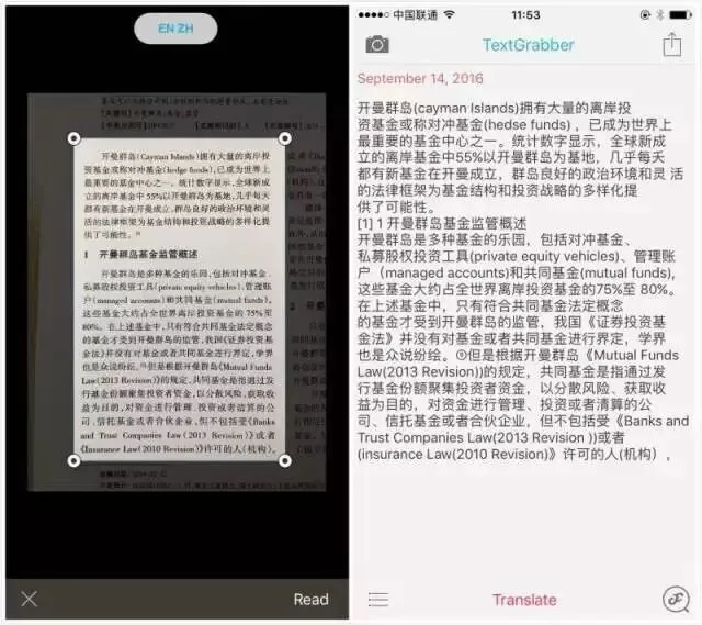 拍摄前把识别语言设置为中文+英文,拍摄后选择识别区域即可完成文字识别。由于这个App是俄罗斯老牌文字识别厂商ABBYY旗下的,所以识别准确率非常有保障。
