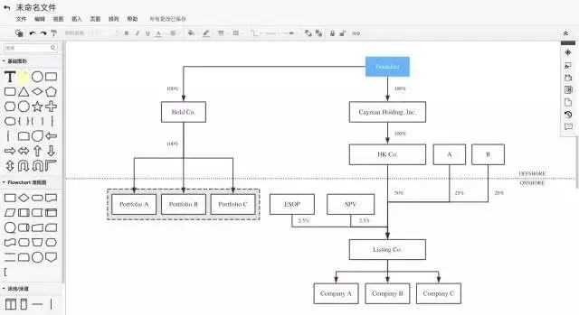 特别值得一提的是,ProcessOn可以邀请多位协作者共同画图,这样一来,修改和协作就变得非常简单。以下是笔者最近使用ProcessOn制作股权结构图的操作界面: