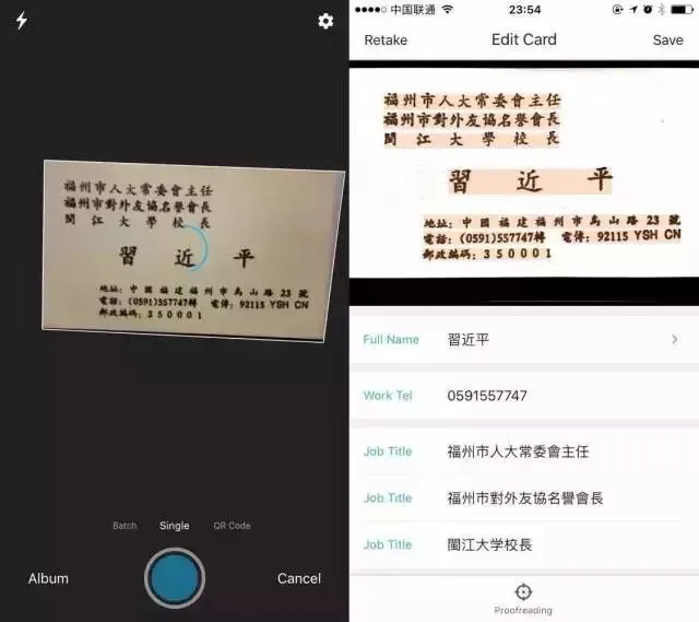 每次出去开会,笔者往往收到一堆名片。名片一多,留着也不是,丢掉也不是,特别是关键时刻需要找人也很难检索。这里笔者向大家推荐手机App——名片全能王,真正解放生产力的App。收到名片后,对着名片拍一张照片,即可录入名片上的所有信息到手机通讯录。