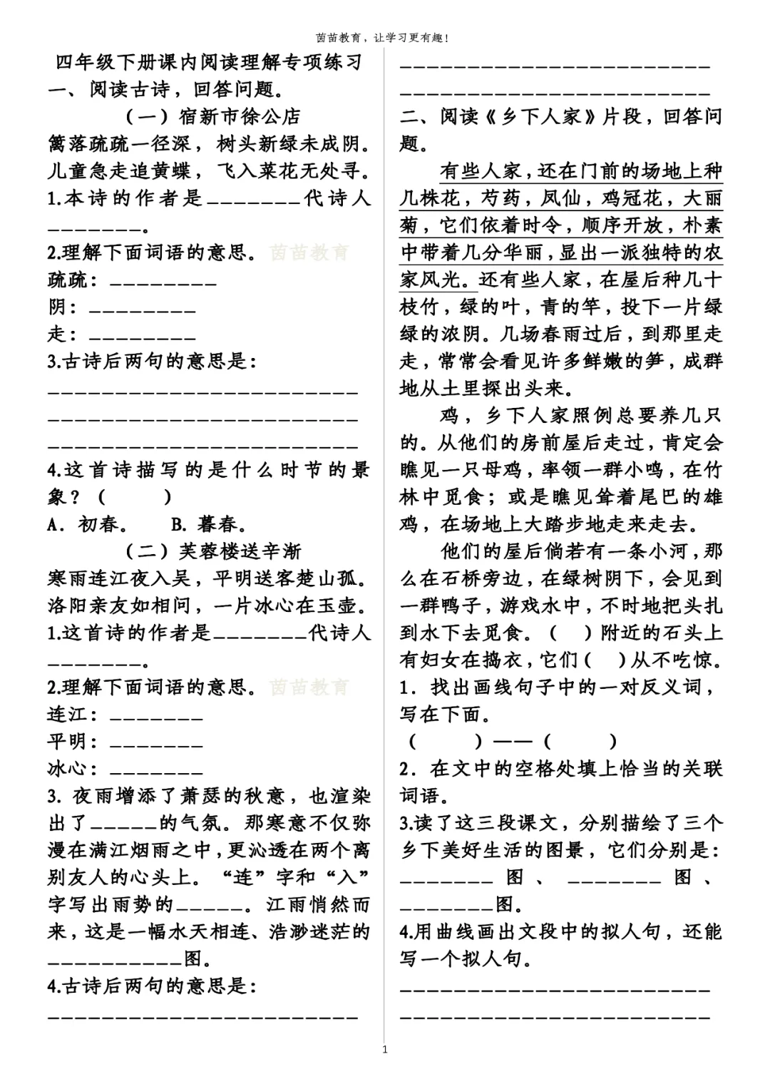 四年级下册语文课内阅读理解pdf下载