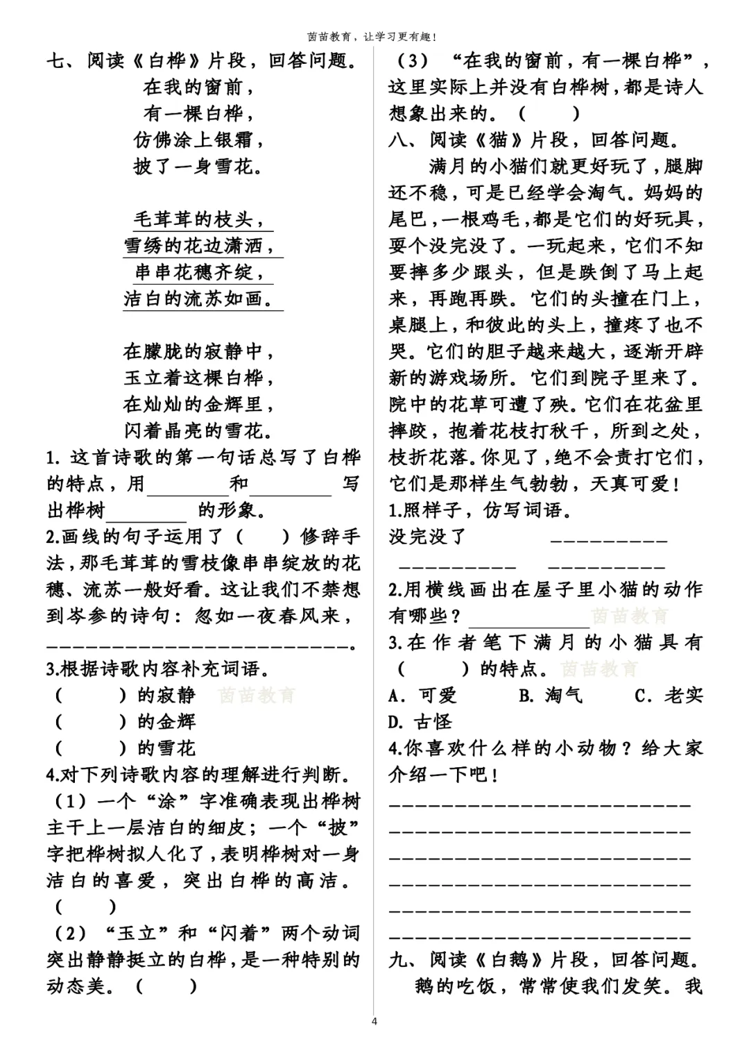 1. 这首诗歌的第一句话总写了白桦的特点,用银霜和雪花写出桦树 通体洁白的形象。