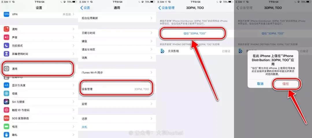 安装好软件后需要信任才能使用,打开「设置」→「通用」→「描述文件(与设备管理)」→「找到相应证书」→「信任」就可以正常的使用了。