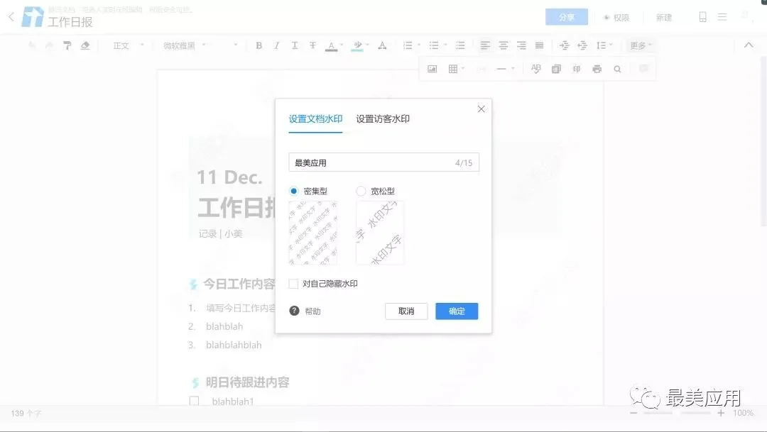 除此之外,「在线文档」中也有很多人性化的功能,比如水印。Microsoft Office Word 的水印不能选择水印密度、文字内容等,「在线文档」的水印打开就是自定义模式,定制自己专属的水印来保护文件。