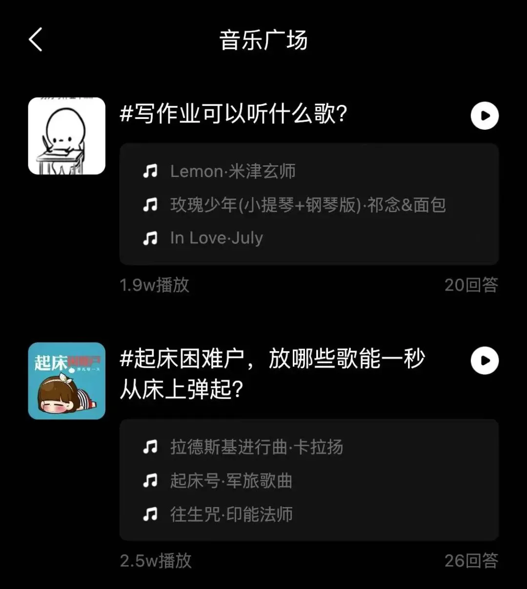 而另一位用户晓妍偶尔会打开看看,刷到“ 听什么歌能把缝纫机踩爆 ”;“ 哪些歌会让你感觉踏入了理发店 ”这样的话题,也会觉得挺奇思妙想的。