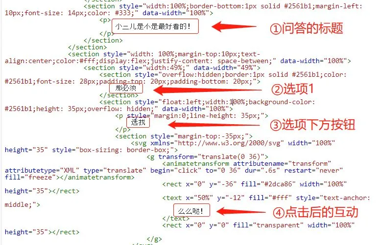 三、我们在代码编辑器中找到如图所示题目的位置,然后就可以进行修改问答的题目、选项以及点击后的互动了。