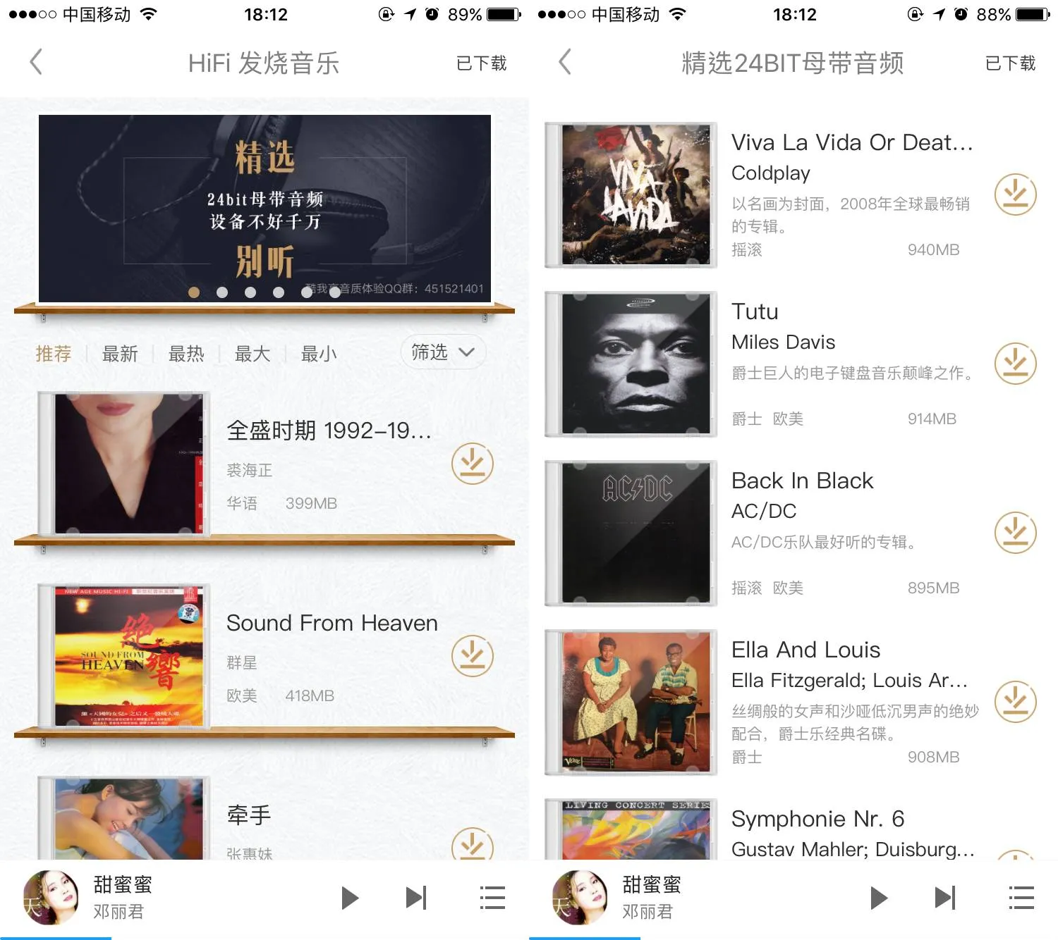 与无损音乐相比,母带音频一首歌的大小会超过100M,有些甚至达到200M,而无损音乐单首仅30M,可以说母带音频实现了录制现场音质的完美还原。从前母带音频作为极端稀缺资源,只活在专业人士的专业设备中。在酷我的“发烧音乐专区”中,母带有24bit/96KHz和24bit/192KHz两种采样率,而且全部为整张专辑,欣赏完整专辑更能体会到音乐中的转承起伏和前后呼应。