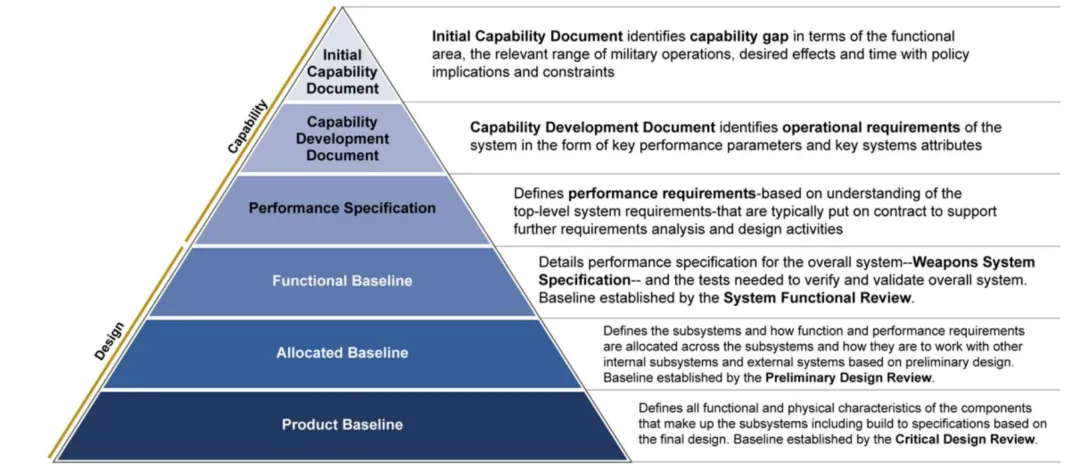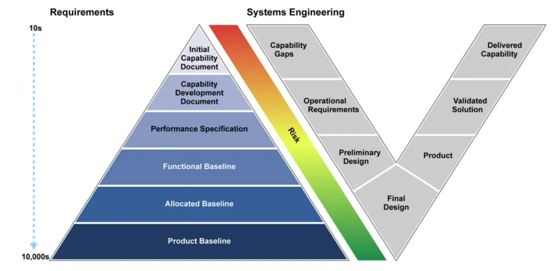 系统工程是一套规范化的流程,核心是将顶层能力需求转化为依托现有资源可实现的、详尽的底层设计要求。国防部要求各项目制定系统工程计划,将其作为指导项目全生命周期系统工程工作的管理工具。据国防部表述,这一规范化流程能够实现对项目的有效管控和需求的可追溯,从而研发出满足客户需求的解决方案。系统工程流程可通过V型模型呈现:始于作战能力缺口的识别与填补方案的选定,随后界定顶层能力需求,并将其逐步拆解为底层设计要求,直至确定最终设计方案。在这一过程中,需求的定义会愈发具体,各层级衍生的需求数量也会持续增加,甚至呈现指数级增长——为数不多的顶层能力需求,可衍生出数万项详尽的设计要求。图2展示了需求分解与系统工程工作之间的关联。