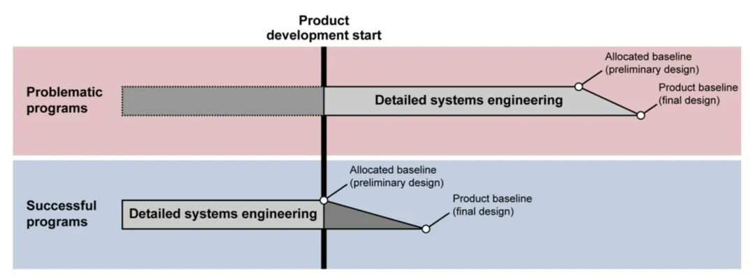 图3展示了成功项目与问题项目的系统工程开展时机,与产品开发启动时间之间的关联。