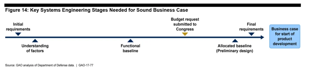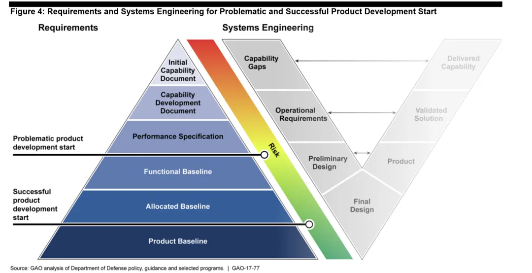 美国政府问责局此前的最佳实践研究还表明,若在产品开发启动前完成精细化的系统工程工作,项目就能通过方案权衡与追加投入的方式化解这些风险,确保相关风险要么被充分消除,要么即便被带入后续开发阶段,也能被清晰认知并配备充足的资源予以应对。