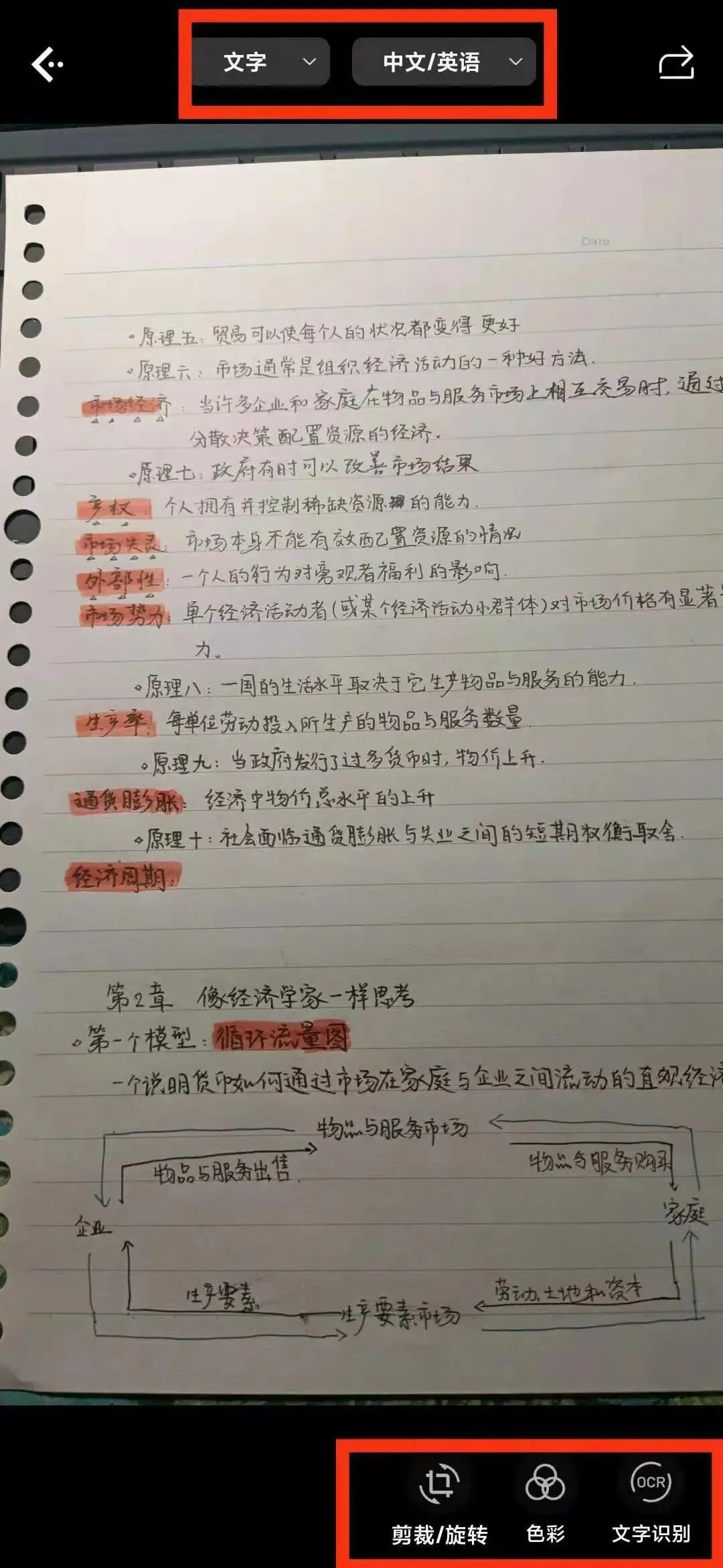 通过拍照识别可以选择翻译,也可以进行剪裁和旋转或者进行文字识别。