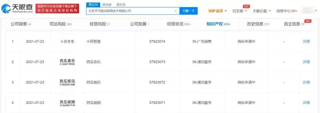 此外,通过天眼查APP显示,字节跳动公司新增“西瓜音乐”商标申请信息,国际分类为通讯服务,目前商标状态为“注册申请中”。