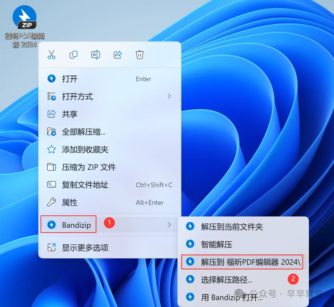 1、下载福昕PDF编辑器 2024软件安装包到电脑上,右键选择【解压到福昕PDF编辑器 2024\】