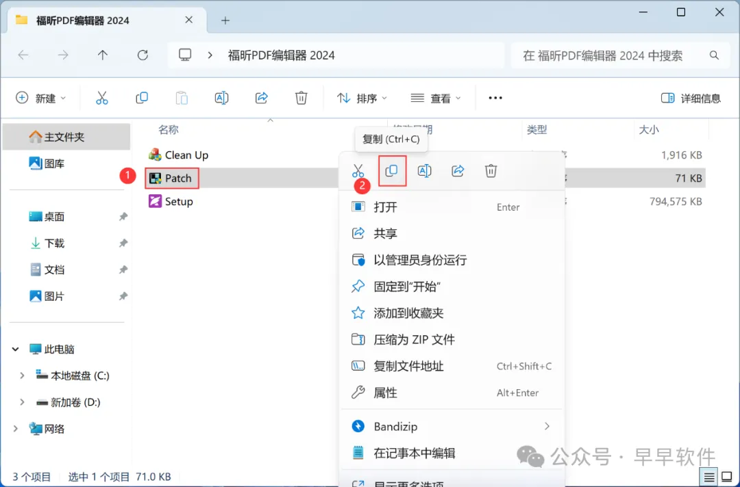 8、回到福昕PDF编辑器 2024文件夹,找到【Patch】应用程序,右键点击【复制按钮】