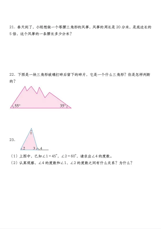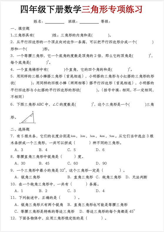 今天给大家准备好了!~四年级(下)数学 三角形专项训练丨可下载打印