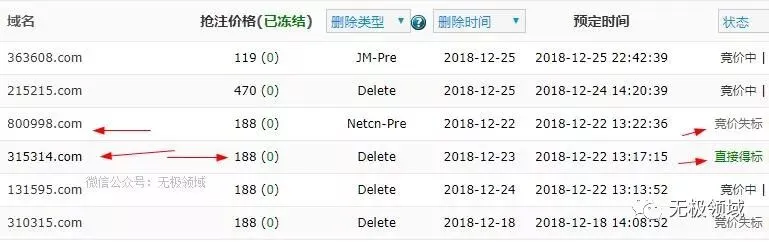 这是哥哥最近的试水情况,315314.com以188元直接到手,竞拍失败的800998.com被人以728元拿下,310315.com被人以195元拿下。