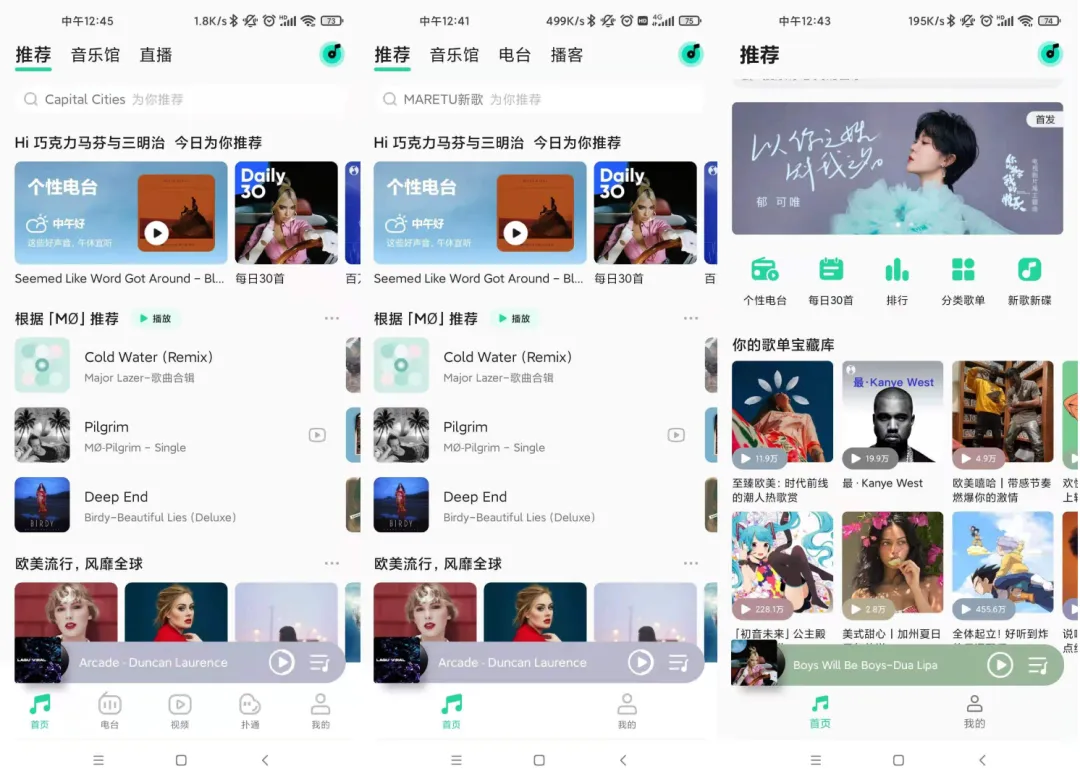 不过,对比QQ音乐简洁版,简洁模式下的QQ音乐显然多了不少功能。如图所示,QQ音乐简洁版的顶部导航栏处仅有“推荐”选项,而简洁模式下的QQ音乐则有“推荐”、“音乐馆”、“电台”和“播客”四个选项,原本放在底边栏的电台选项被移到顶部导航栏,两者均隐藏了直播、视频和扑通页。