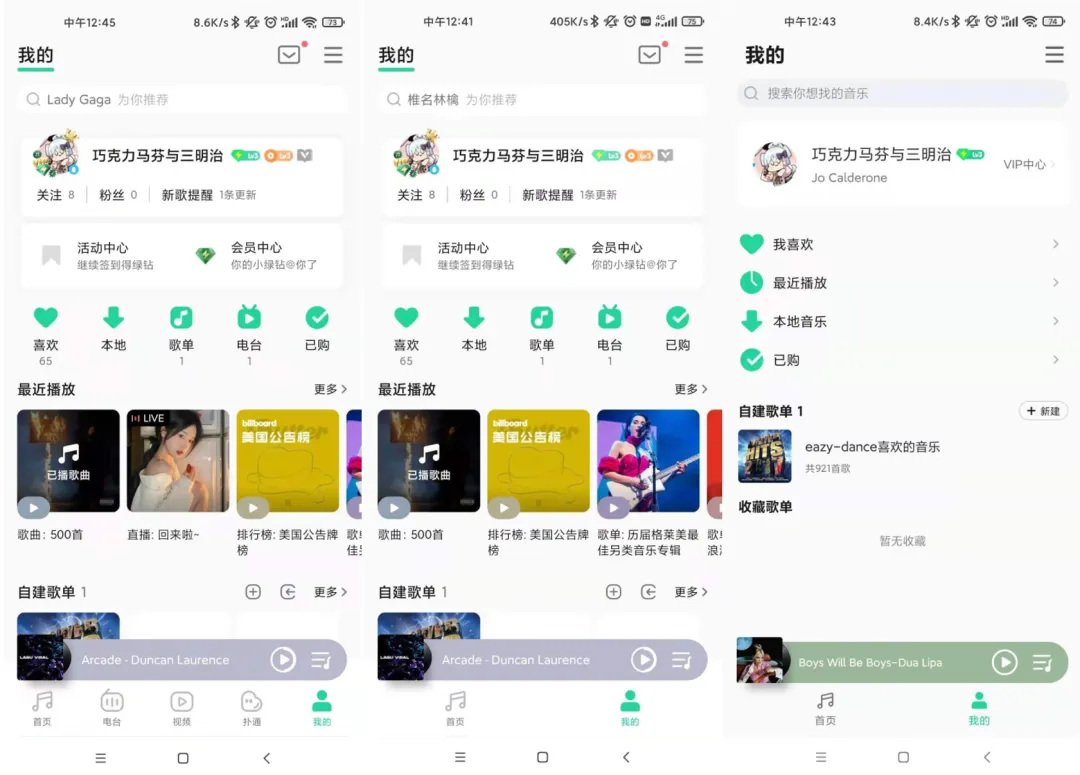 然后是音乐体验,无论是QQ音乐简洁版,还是QQ音乐“简洁模式”,腾讯官方都没有对音乐服务进行精简。比如庞大齐全的曲库,小雷搜索了不少自己喜欢的ACG曲目、欧美音乐以及周杰伦等版权曲目,可以说歌手的专辑一个没少,歌曲数量完整,和原版一模一样,无损音质、听歌识曲、歌单收藏、歌曲推荐等功能服务一应俱全。