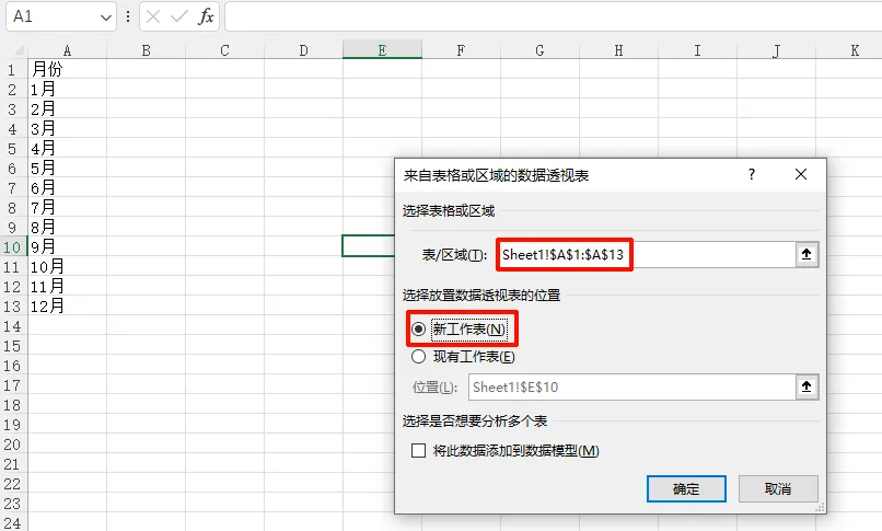 Step2.点击【插入】-【数据透视表】,【表/区域】选中1月-12月的单元格,点击【确定】。