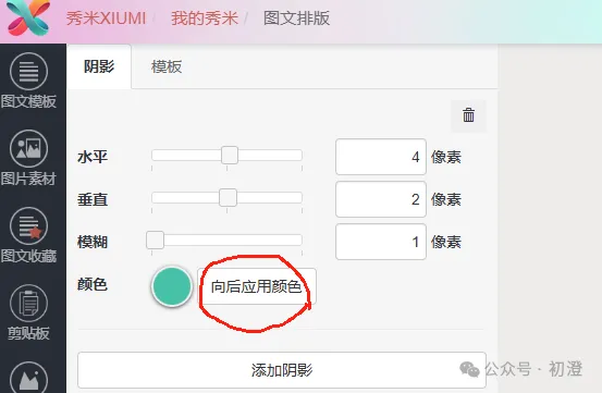 在文字阴影操作界面,输入对应的数值与颜色,其中偏移X、偏移Y可设置负数值;设置好点击应用。