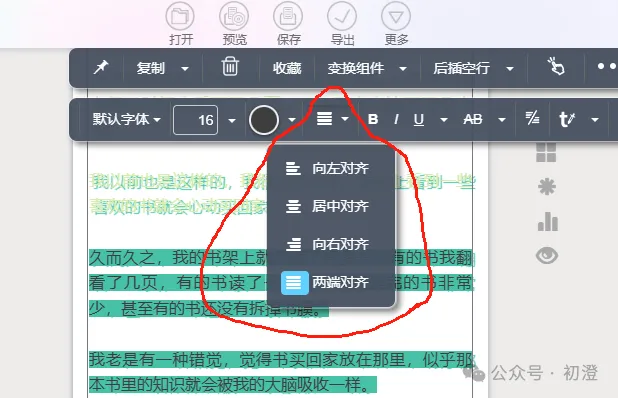 系统默认文字粘贴到编辑界面后是两端对齐,其他三种对齐被折叠在了两端对齐右边的小三角里。