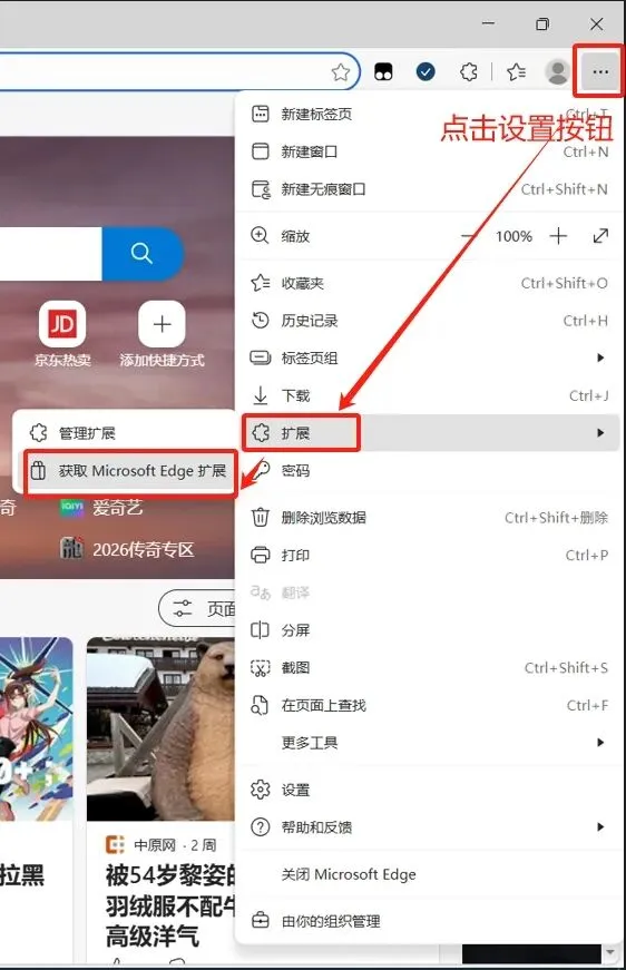 点击浏览器工具栏最右侧的设置按钮,在弹出的功能列表中,选择 扩展-> 获取 Microsoft Edge 扩展。
